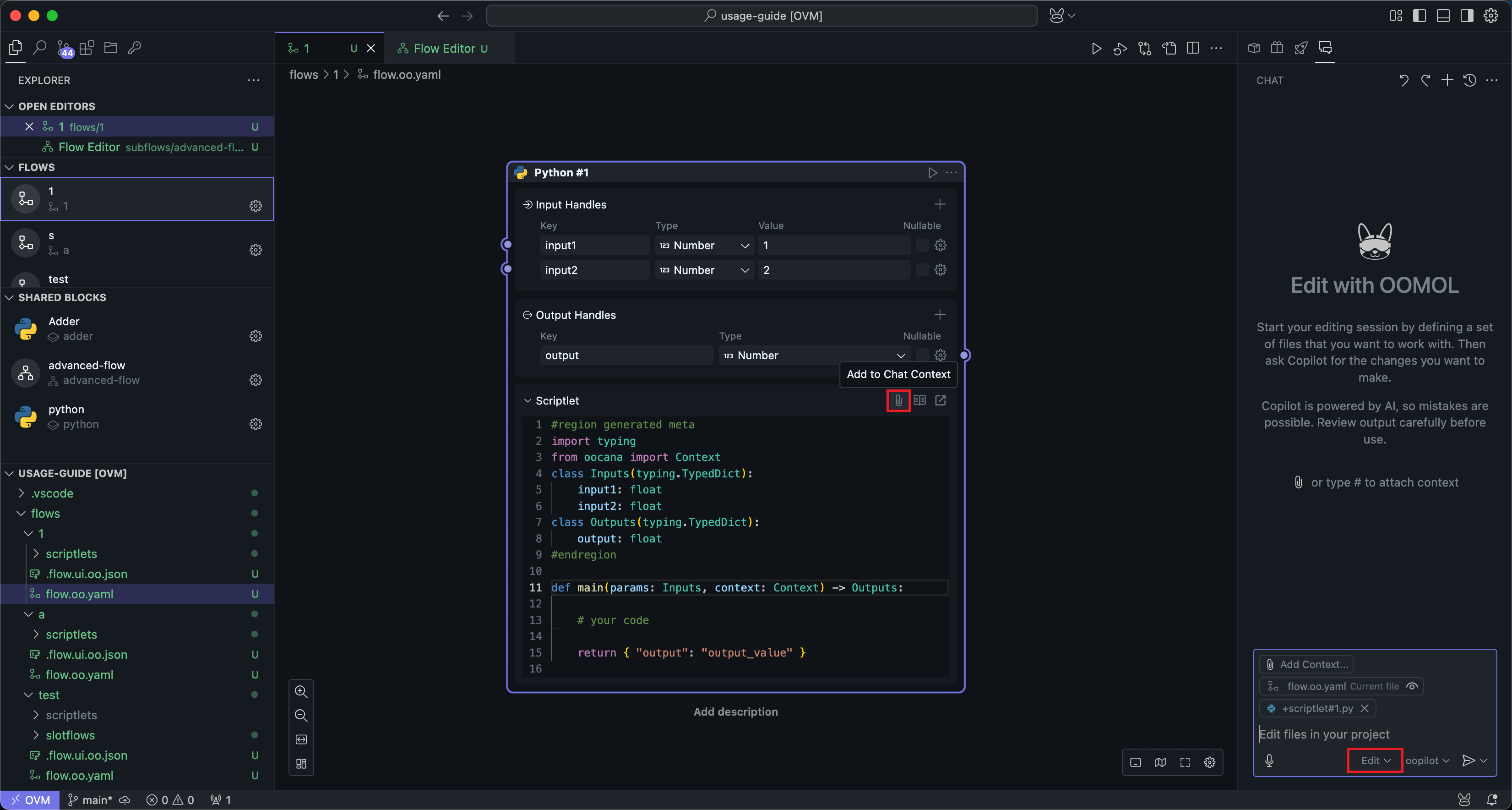 When editing code, you can try having AI help you implement functionality. In the menu bar of the scriptlet code box, click the Add Chat to Context button to open the AI chat box on the right side.