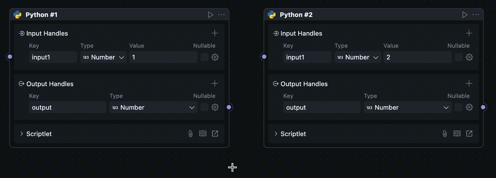 You can quickly create a new Handle by moving the wire end above or below an Handle while connecting. The newly created Handle will maintain the same name and type as the connected Handle, eliminating the need for additional configuration.