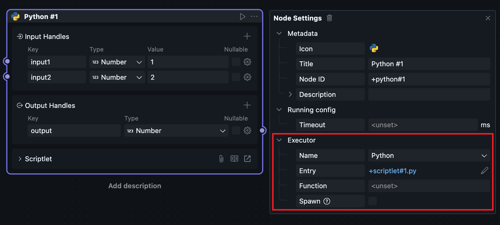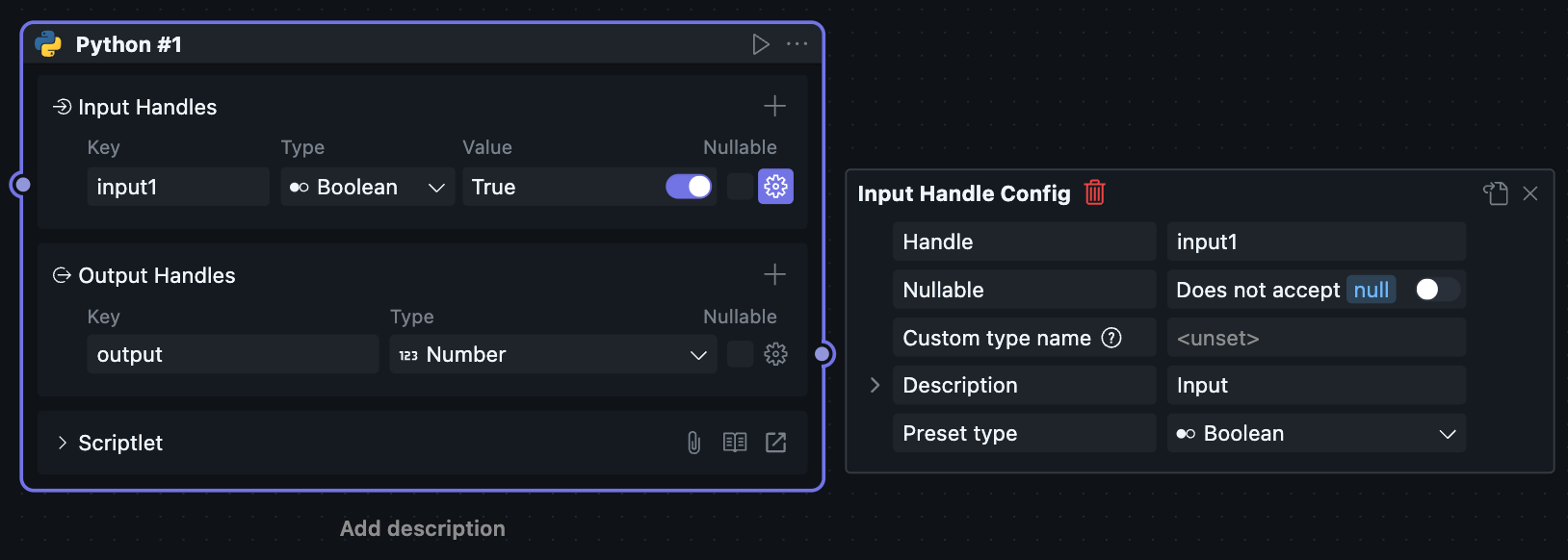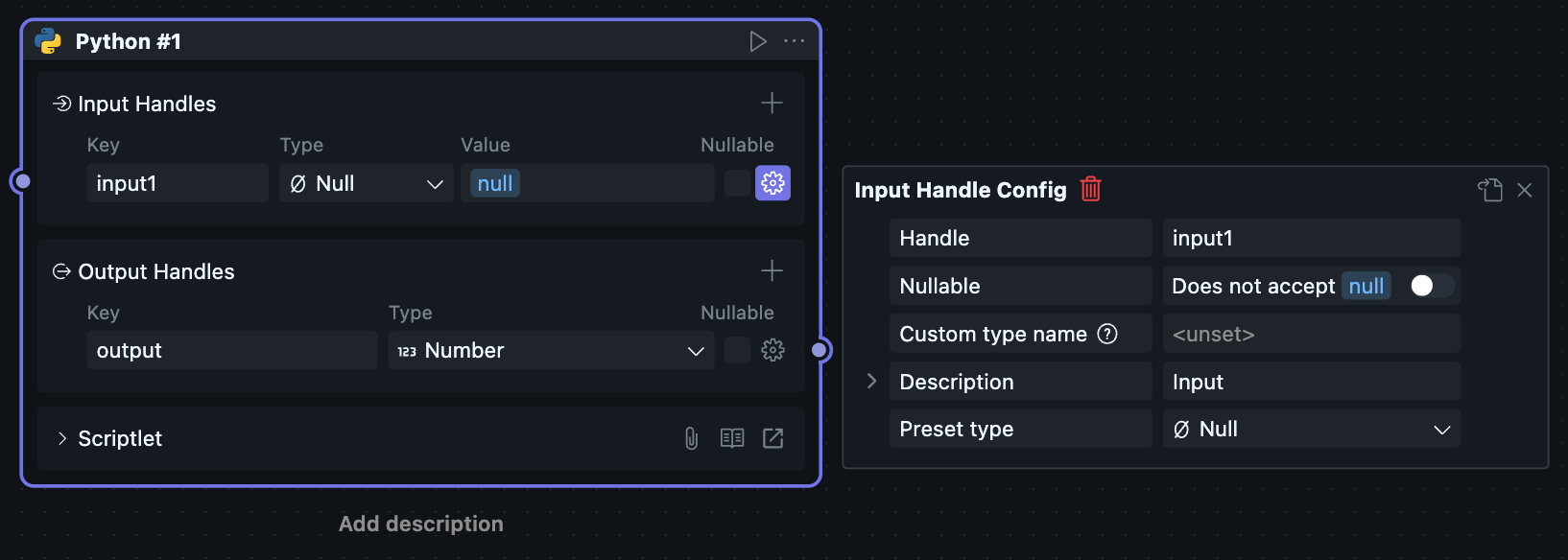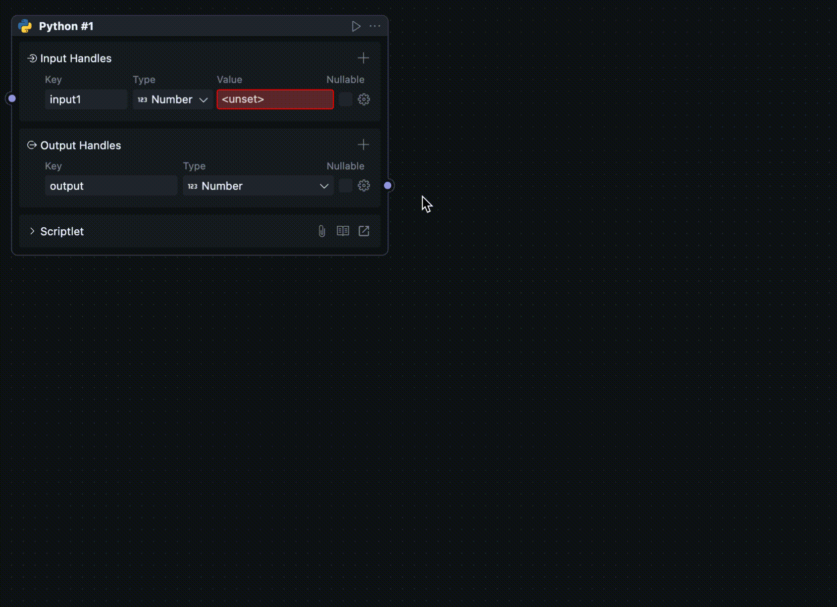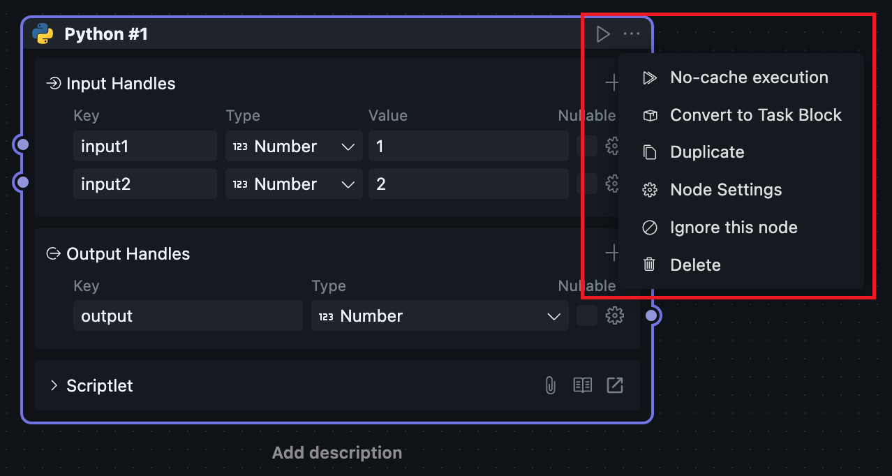 Since scriptlet Blocks can only be created and used within workflows, scriptlet Blocks have both Node and Block attributes, causing the Node configuration and Block configuration of scriptlets to be merged together.