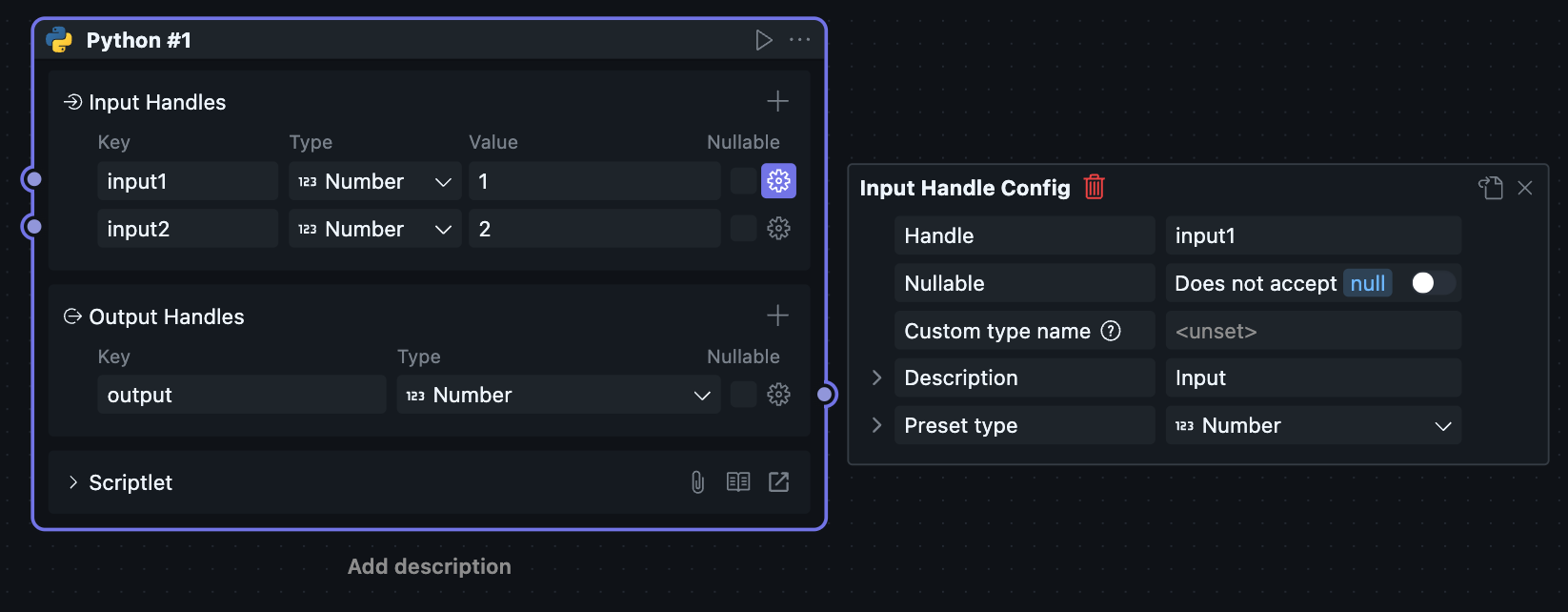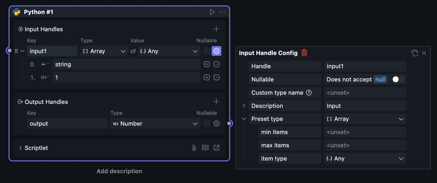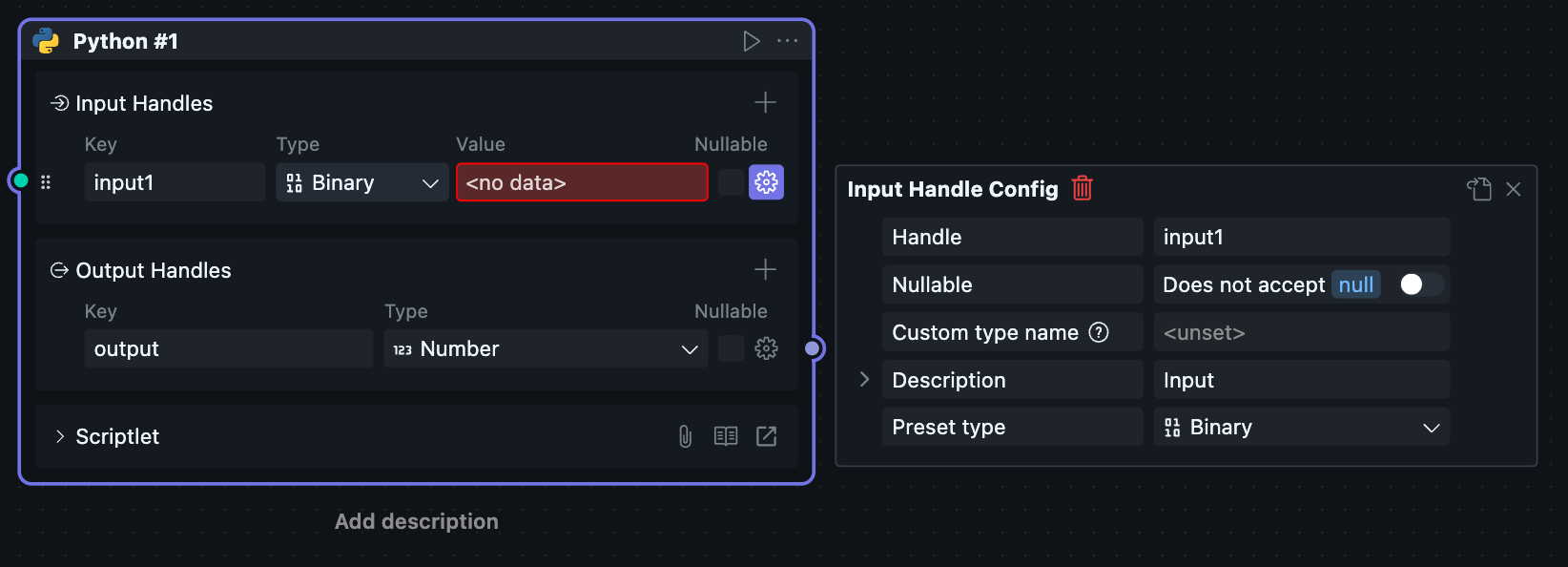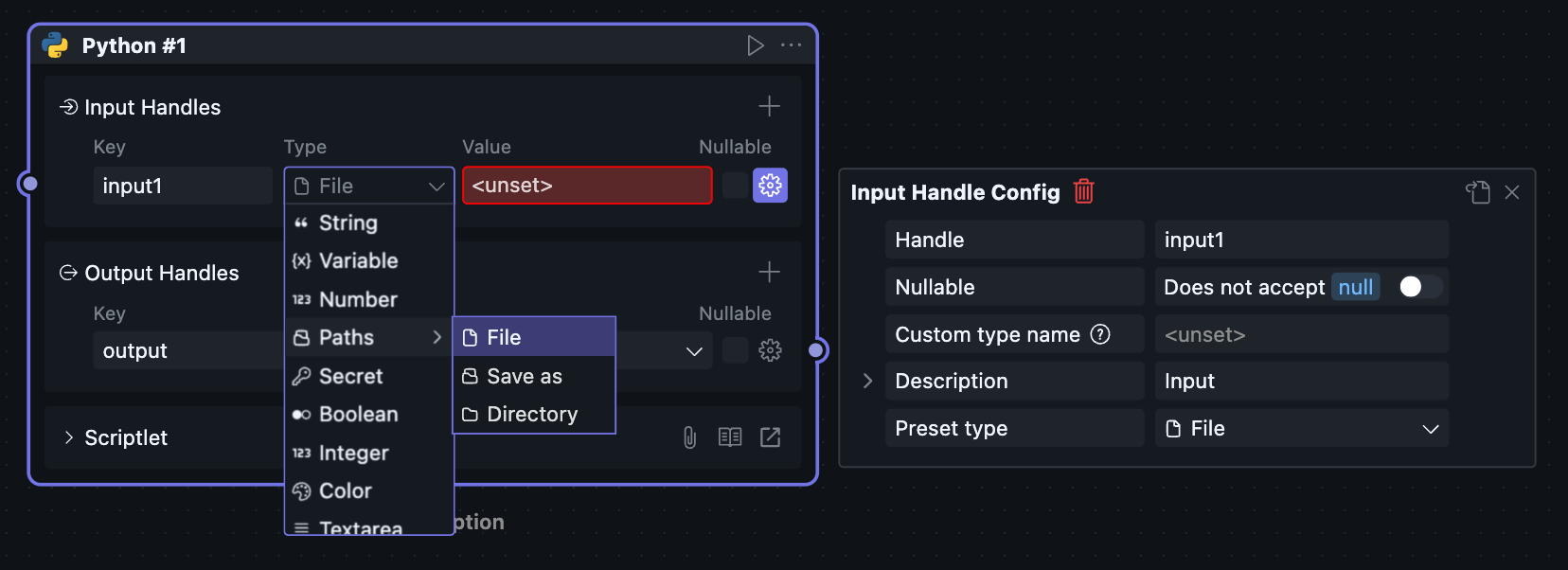 Since scriptlet Blocks can only be created and used within workflows, scriptlet Blocks have both Node and Block attributes, causing the Node configuration and Block configuration of scriptlets to be merged together.