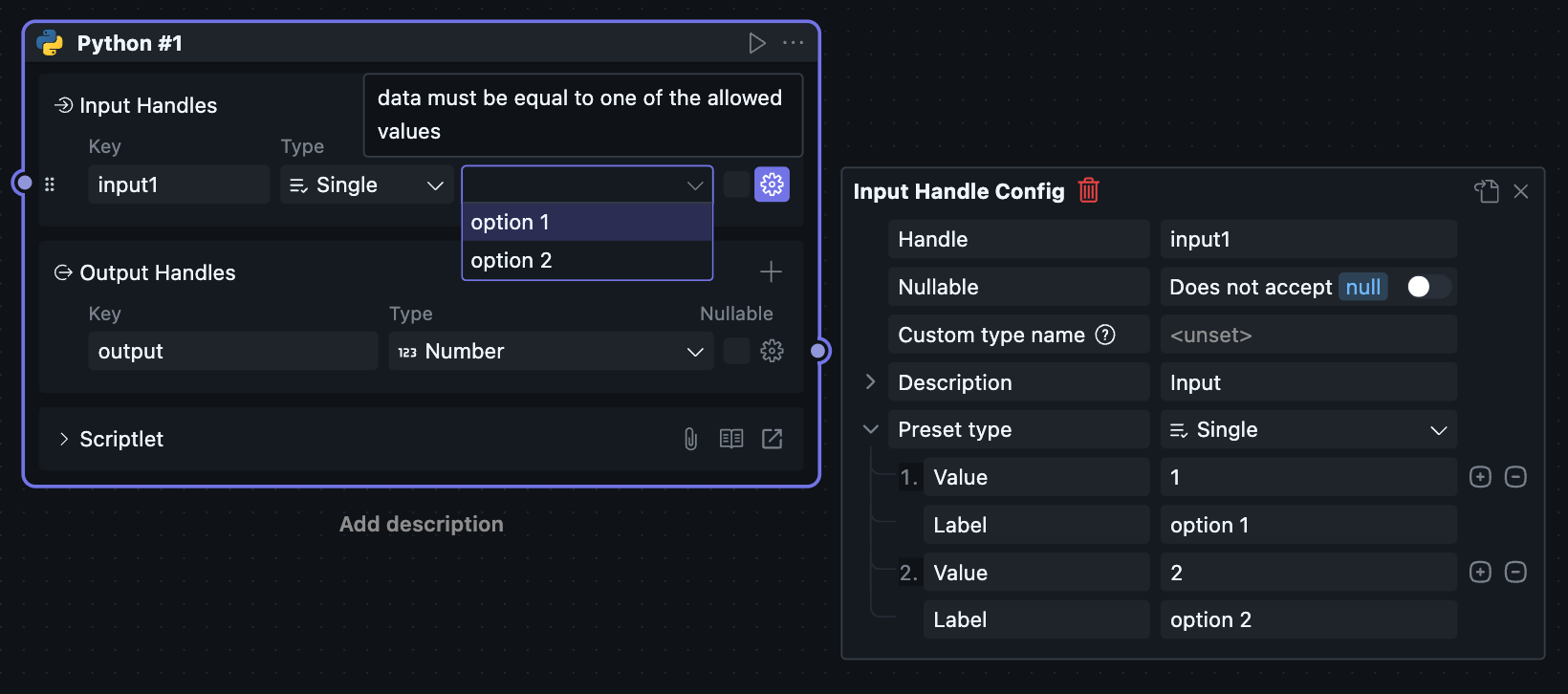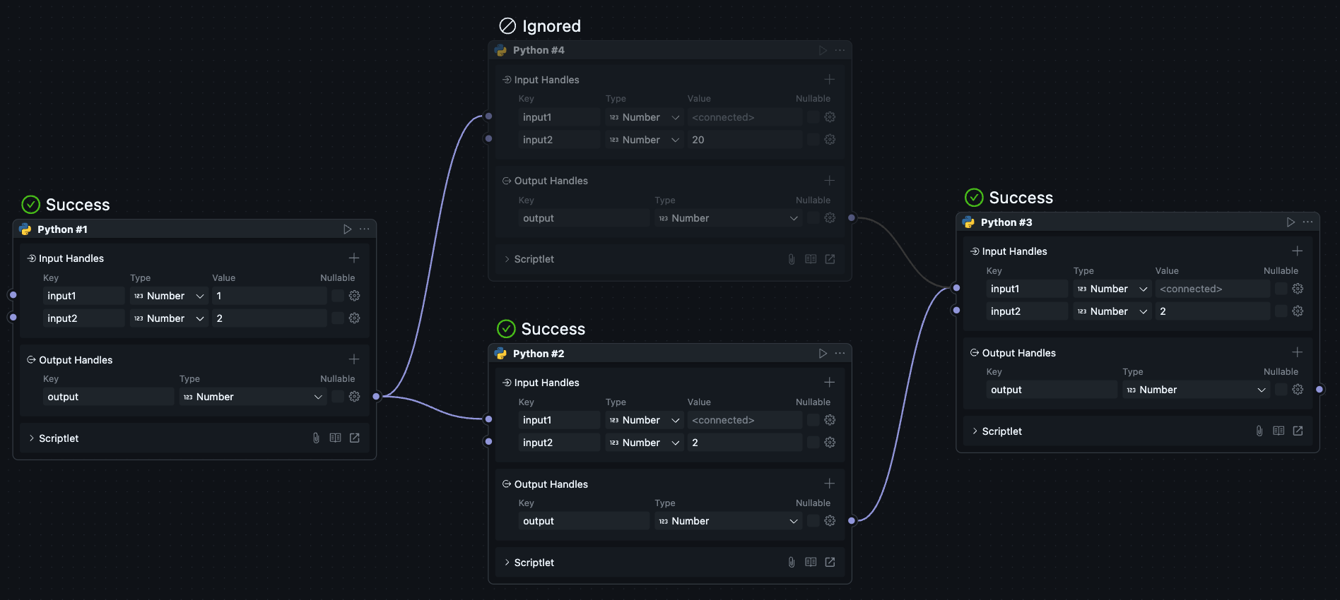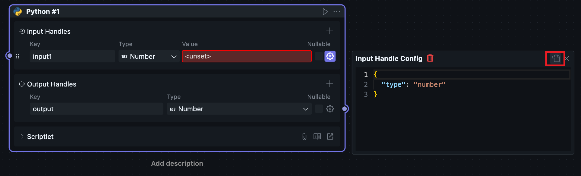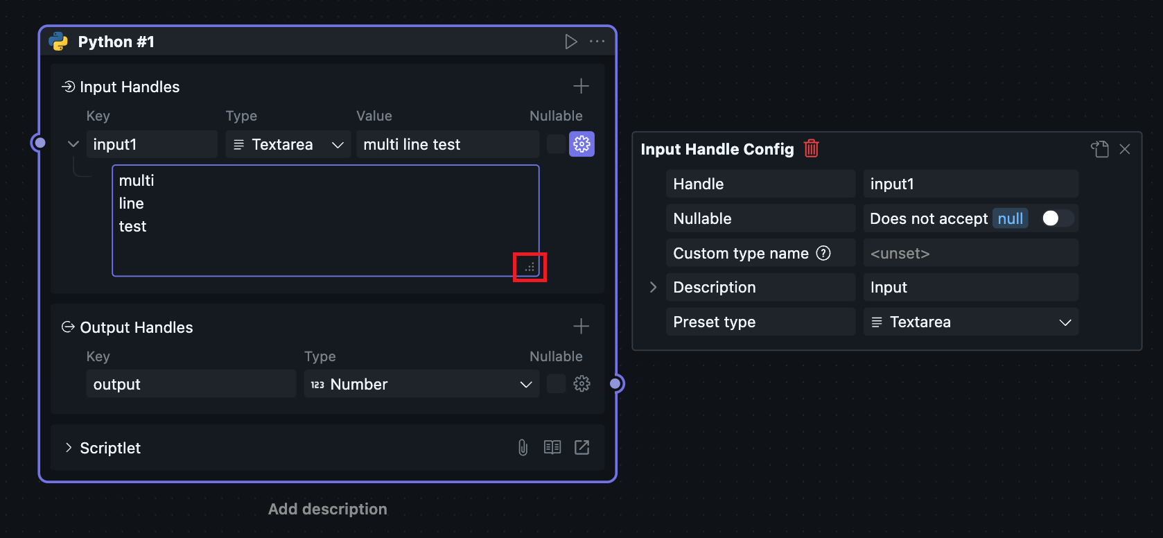 Since scriptlet Blocks can only be created and used within workflows, scriptlet Blocks have both Node and Block attributes, causing the Node configuration and Block configuration of scriptlets to be merged together.