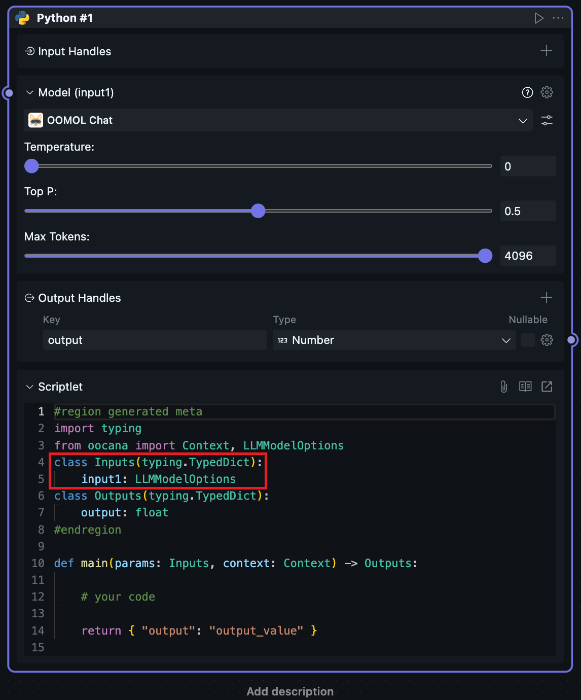 When selecting model, the input Handle will be converted to an AI model selection Handle. This Handle cannot be connected, and input values are fixed to user-selected and configured model parameters.