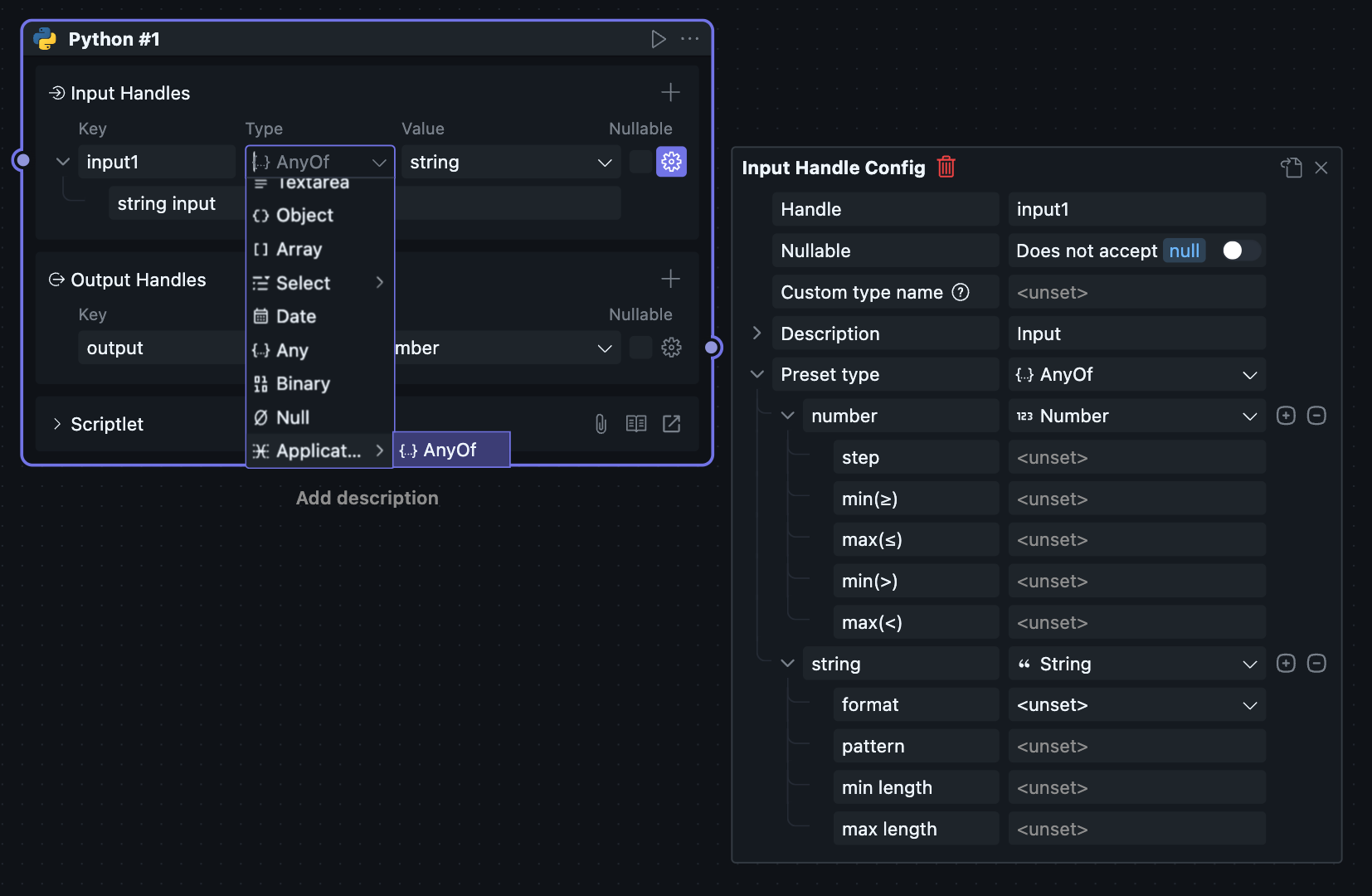 After selecting Any type, the right data input field will have a data type button for selecting input value types, which doesn't affect Handle type restrictions.