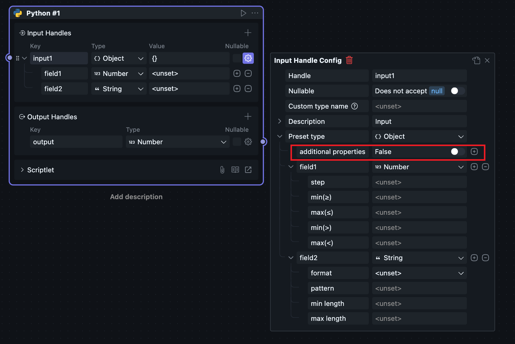 In sub-configuration items, there's an additional properties configuration, indicating whether the current Handle allows elements other than those specified in the Handle type. For example: