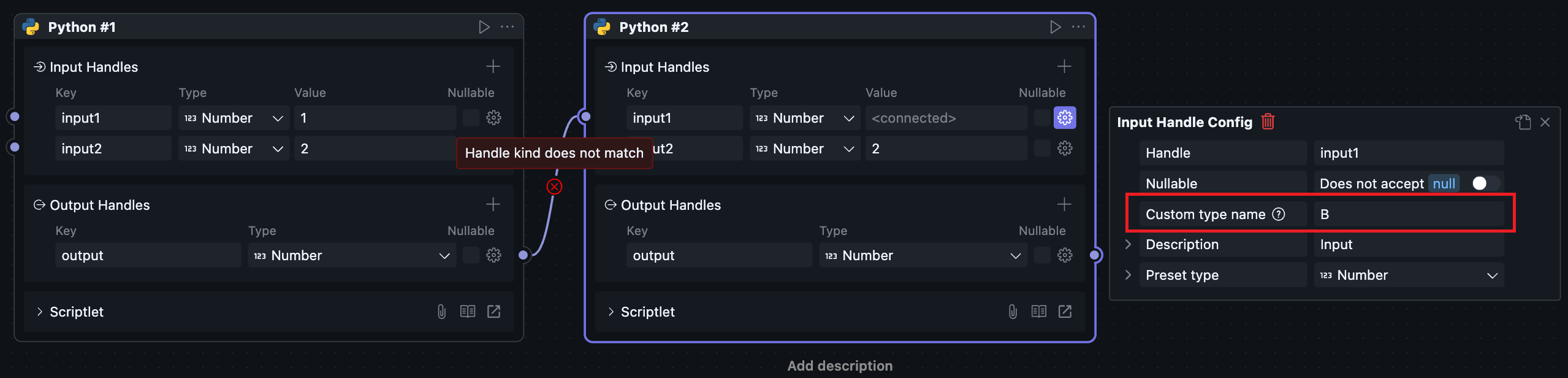 For variable type Handles, the connected Handle must be the same language and variable type. If one side is a shared Block, the other side needs to be a Block from the same package.