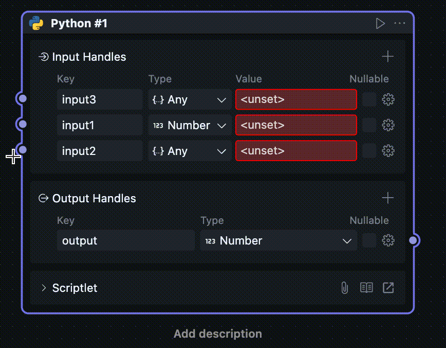 Although this type of value can be serialized, it cannot be meaningfully displayed, so there's no corresponding representation and configuration in the Handle. This type of Handle can only be connected and cannot set values through data input fields.