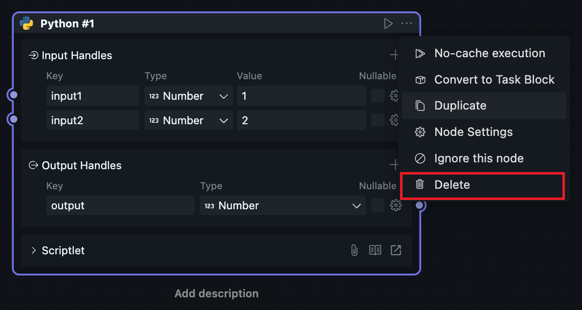 The delete function can remove the current Node. You can use the menu button or shortcut ctrl + shift + delete(Windows) / cmd + shift + delete(MacOS). This function has different behavioral logic for scriptlet Blocks and shared Blocks: