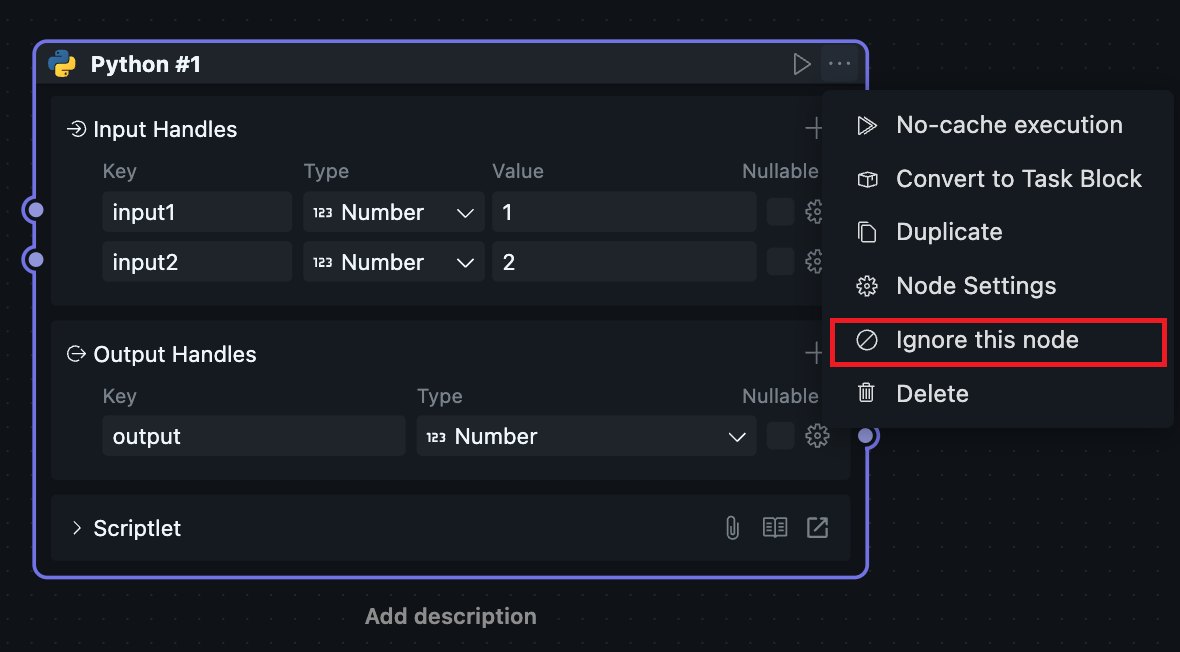 Click "Ignore this Node" to set the Node to ignore status. When running the current flow, this Node and subsequent Nodes will be skipped.
