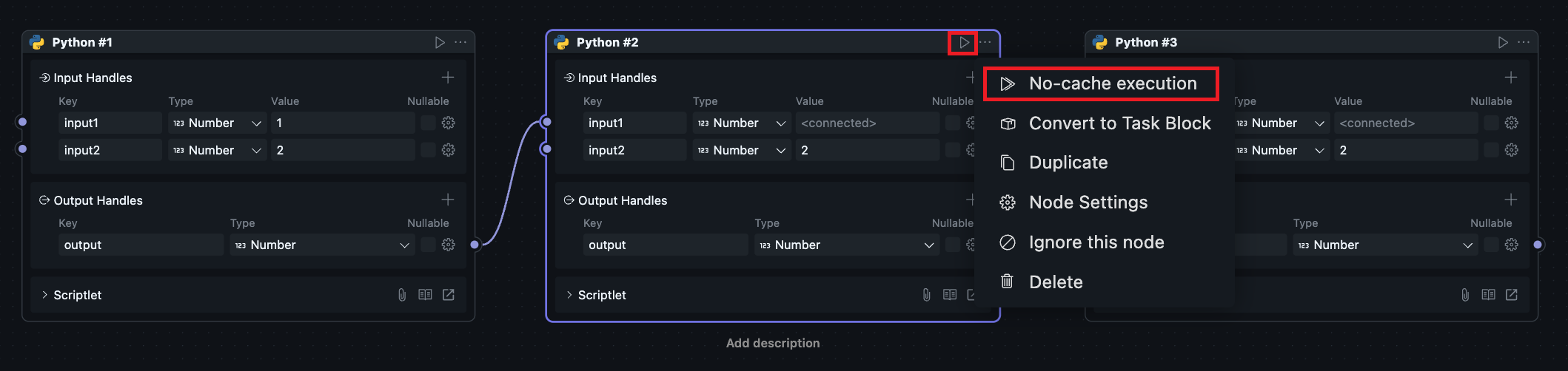 If the current Node's upstream output Handle has variable types, running will always trigger upstream Node execution regardless, because we cannot cache variables in the code execution environment.